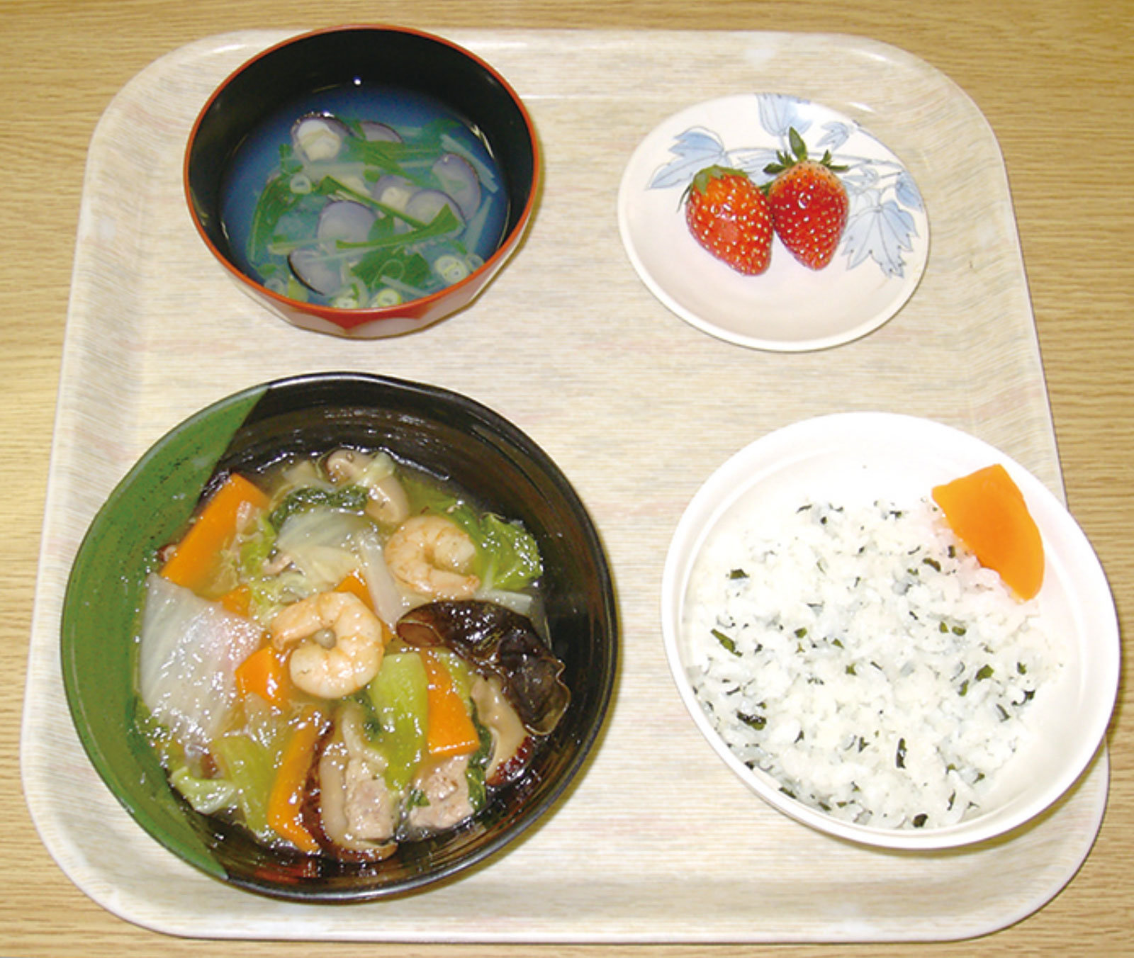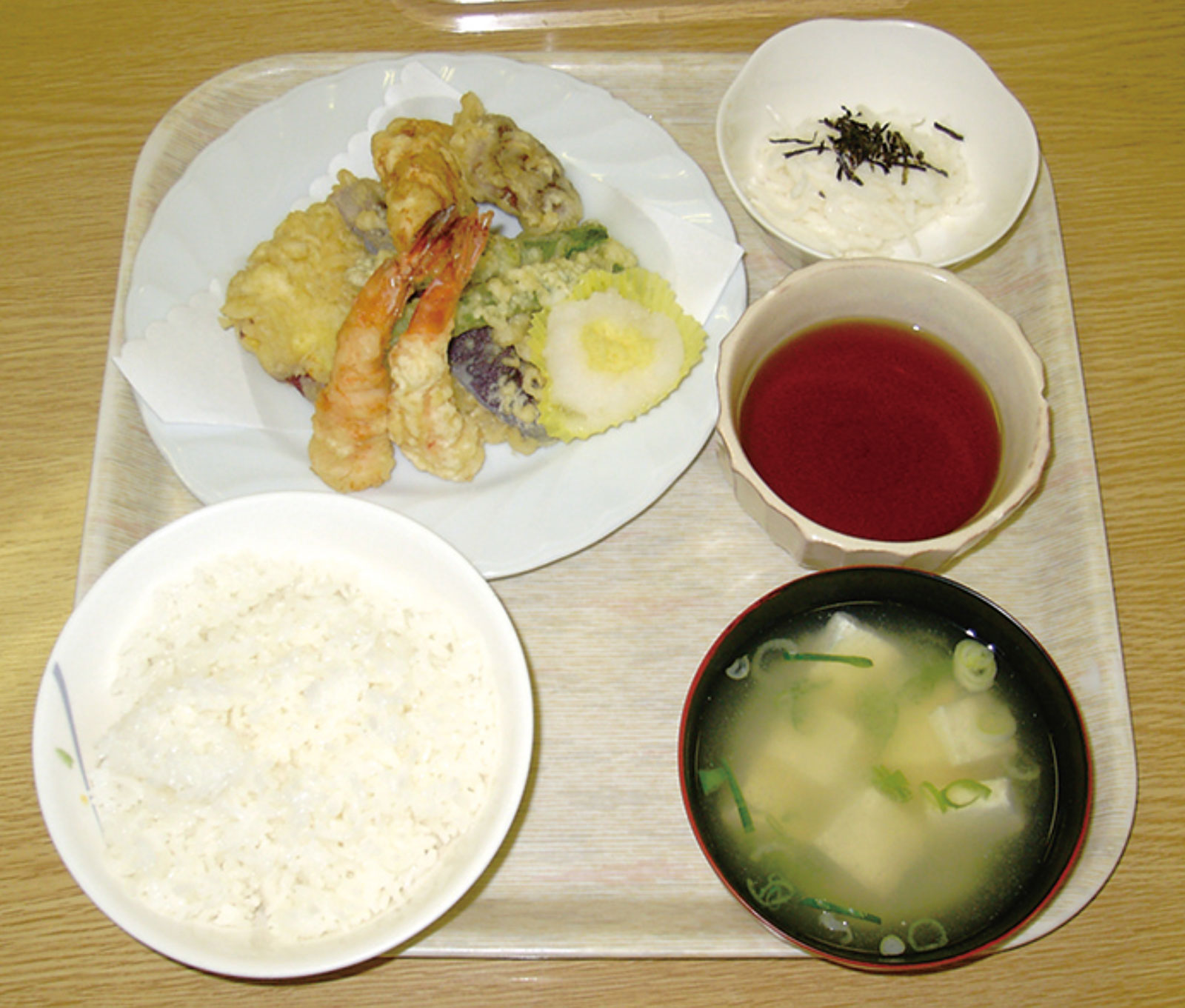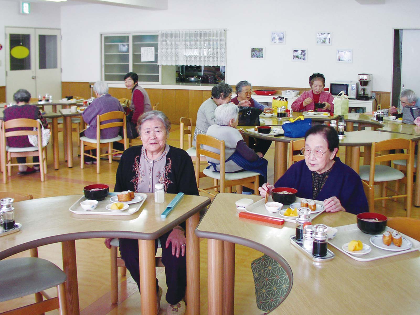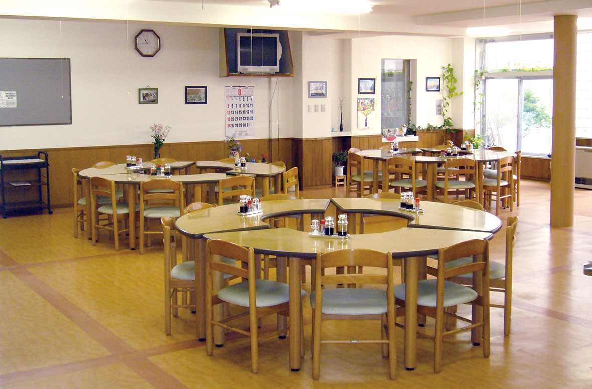 1日3食、調理師他スタッフが心をこめて温かいお食事を提供致します。丁寧に手作りし、できたてを食べて頂けるようお出ししています。お食事は中庭を望む明るく広い食堂で、皆さんで楽しくお召し上がりください。